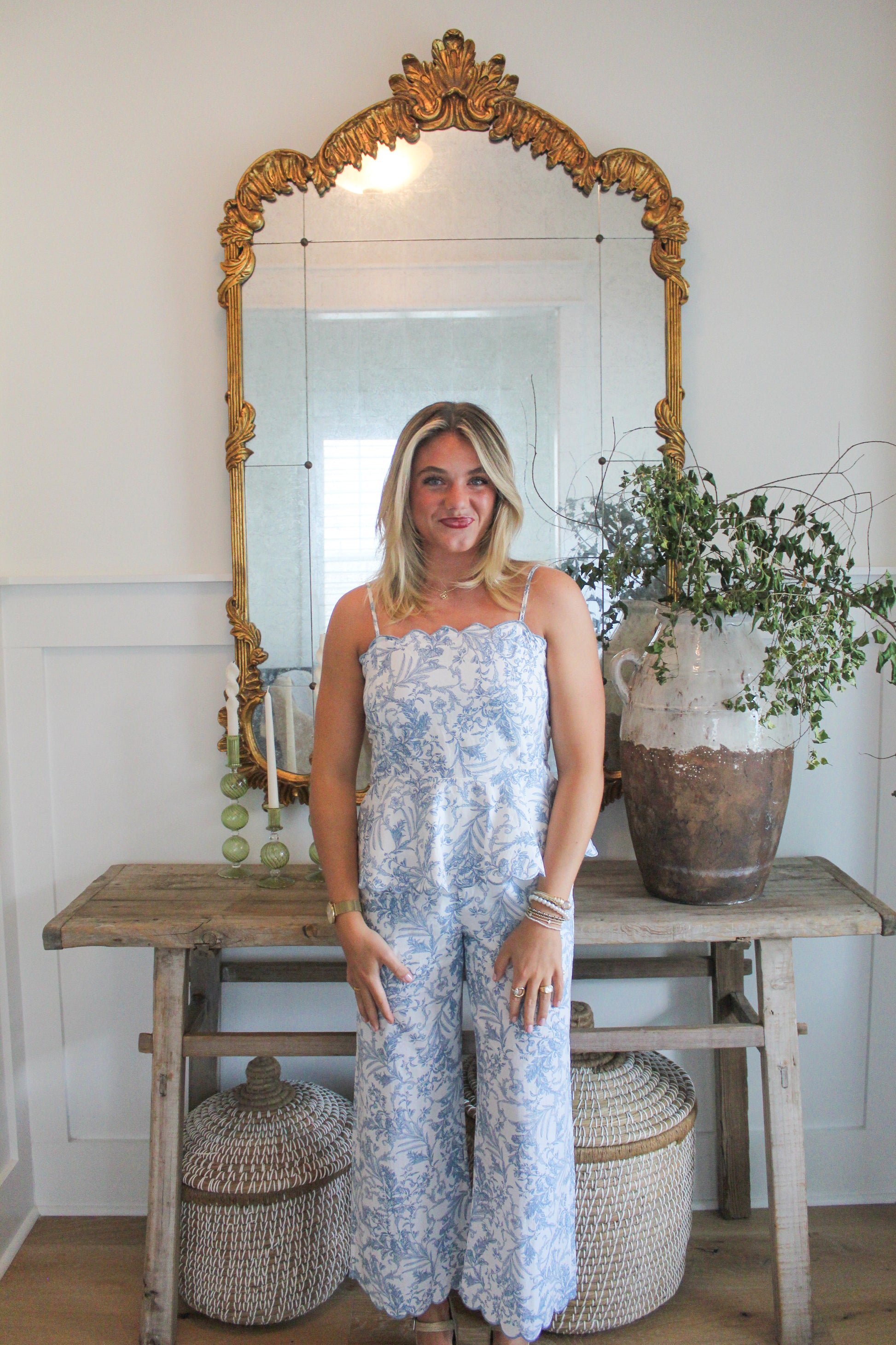 The heart of coastal summer style. This two-piece set features a soft blue and white floral pattern with delicate scalloped detailing along the hem and top. Designed with both elegance and ease in mind, the flowy pants include hidden pockets — because beauty and practicality should go hand in hand.