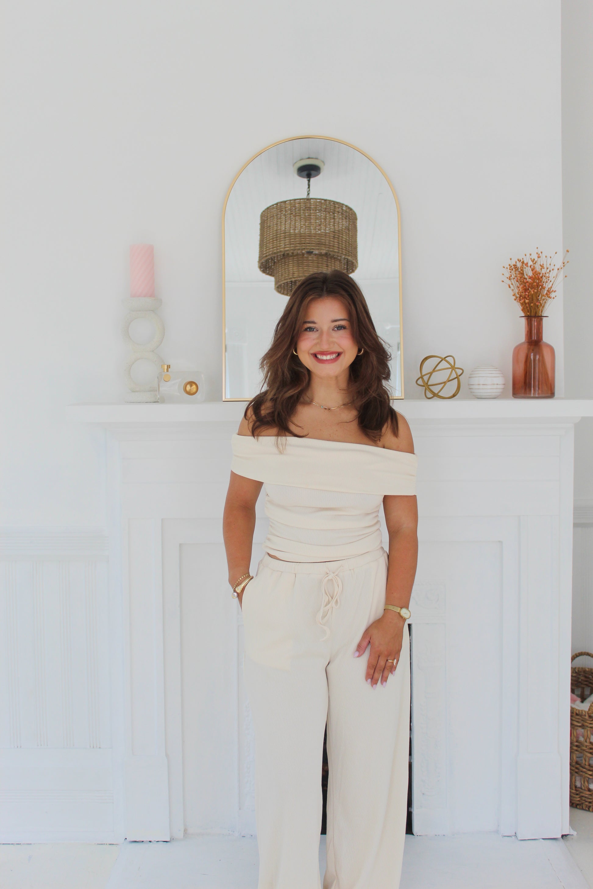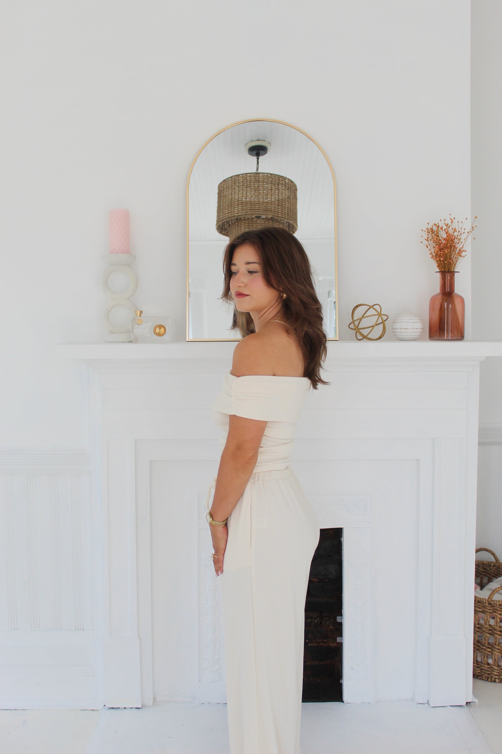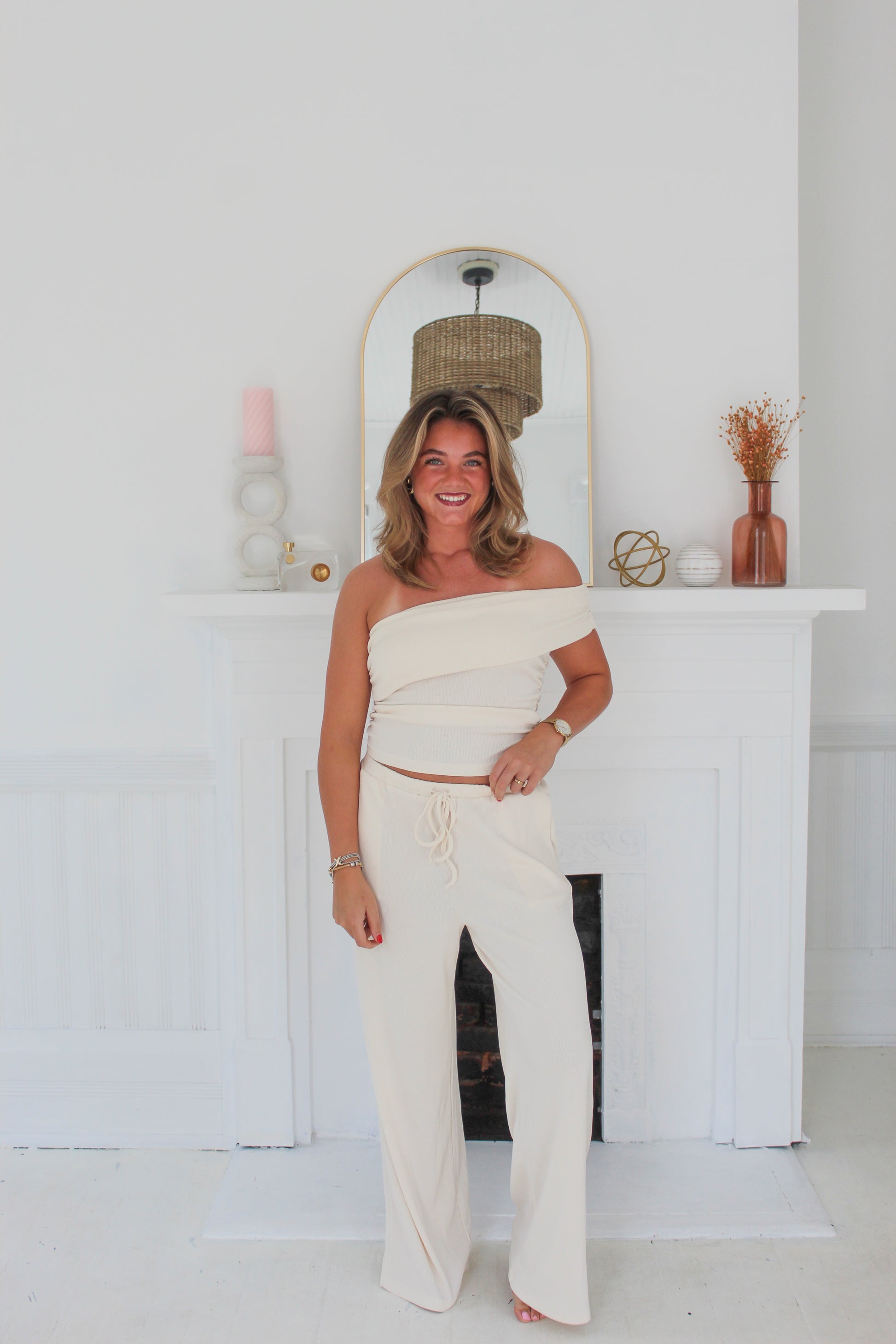 Slip into the understated elegance of the Ivory Hours Lounge Set— a creamy, cloud-soft ensemble designed for moments that blur the line between leisure and allure. Its versatile neckline offers two effortless looks: draped off one shoulder for a relaxed charm, or both for a sultry, effortless feel. Whether you’re savoring a slow morning or dressing it up for an evening in, this set wraps you in comfort without compromising sophistication.